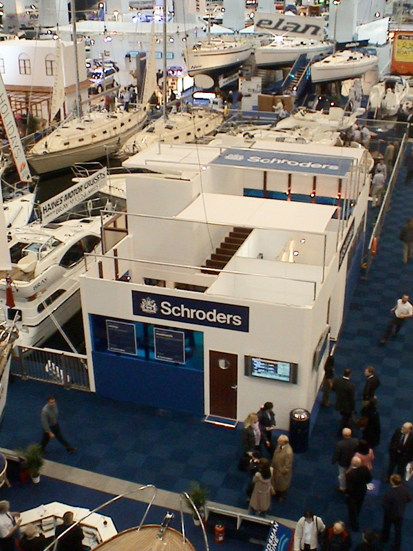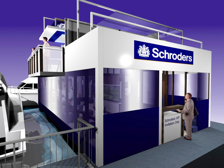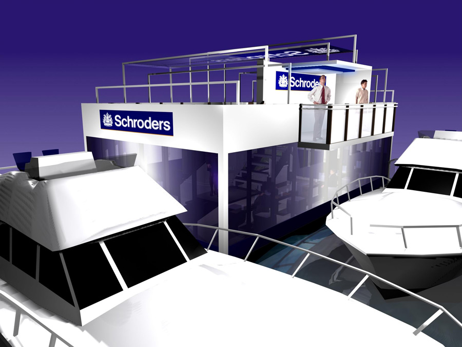 Full design, build, fabricationa nd install for a multi level area for entertaining clients and also to view the activities on water at the Schroders London Boat Show 2003.